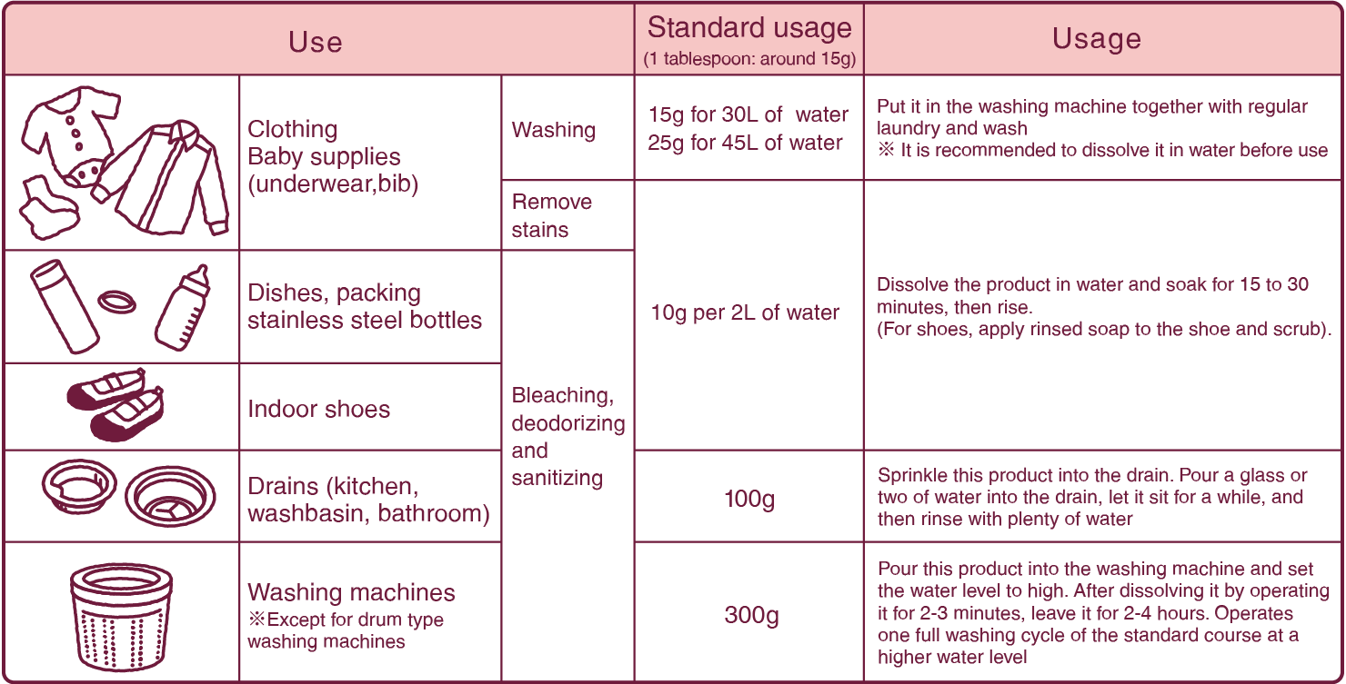 Sa svojim efektima izbeljivanja, dezodoriranja i sterilizacije, ovaj proizvod je veoma koristan u širokom spektru situacija.