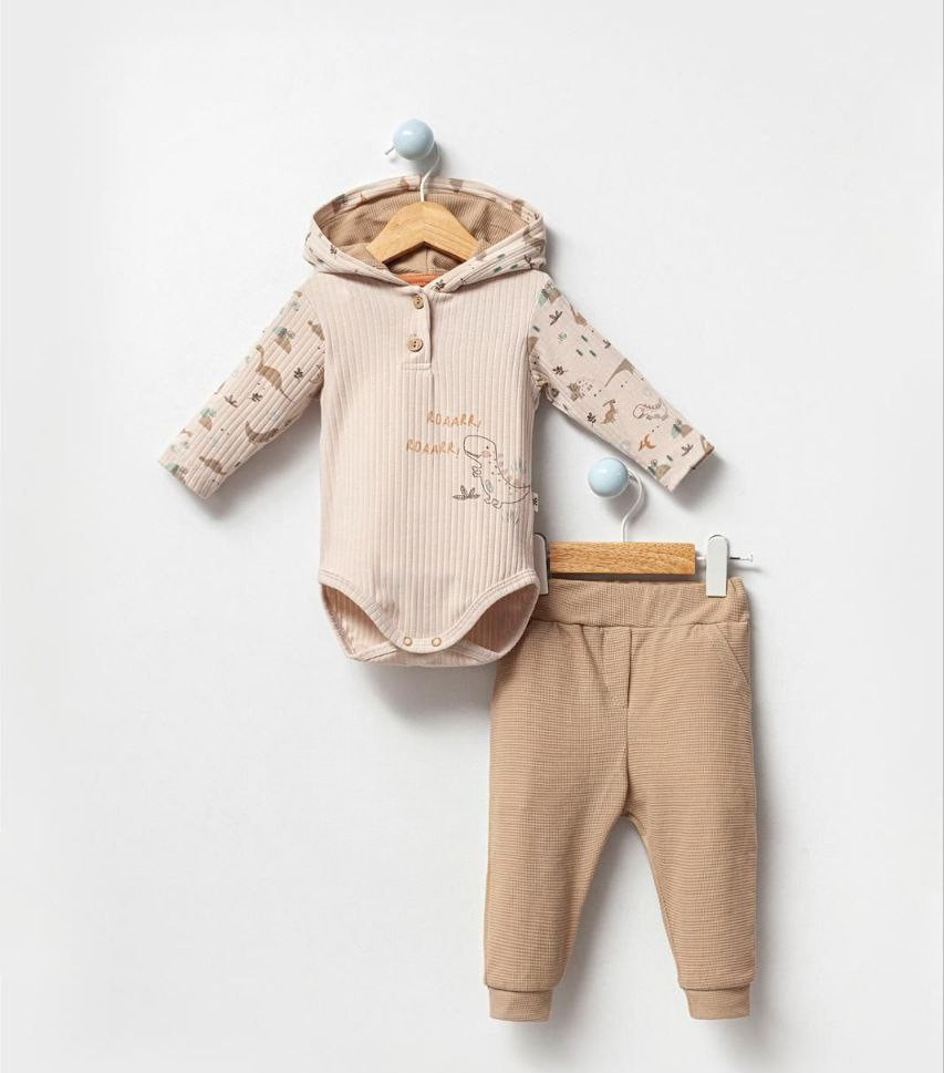 Ovaj nežni bebi komplet sastoji se od rebrastog bodija s kapuljačom i mekanih pantalona, osmišljenih tako da bebi bude prijatno u svakoj situaciji.