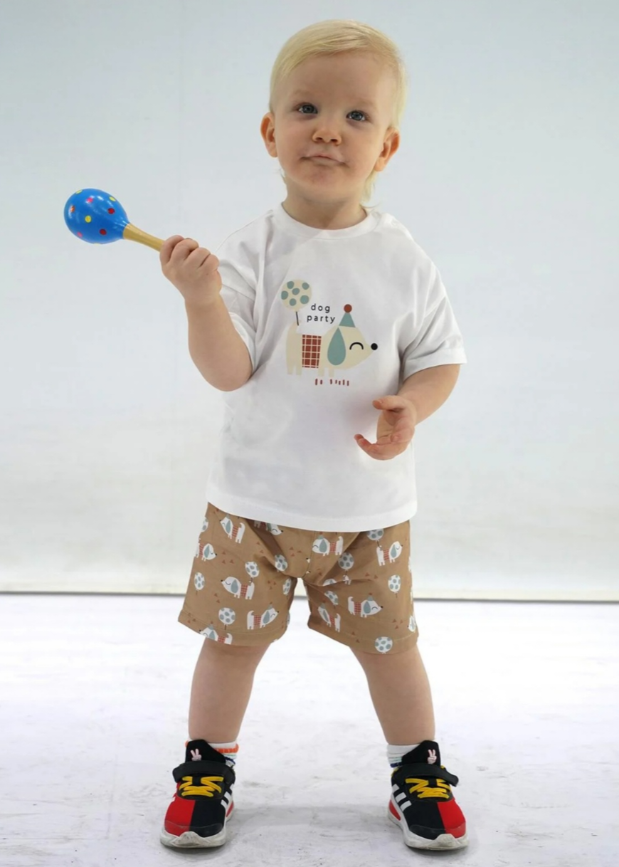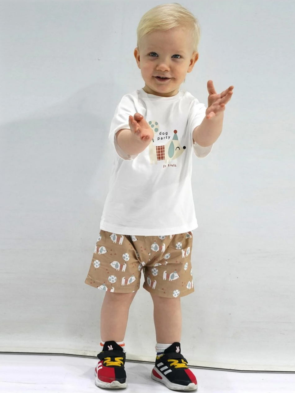 Presladak letnji komplet za bebe brenda Kidaxi savršen je za udobne i razigrane dane. Set se sastoji od mekane majice kratkih rukava i laganih šortsića, idealnih za toplije vreme. Majica u neutralnoj, svetloj nijansi ukrašena je simpatičnim printom kuce sa balonom i natpisom „dog party“, koji donosi veselu i nežnu notu celom outfitu. Praktični drikeri na ramenu omogućavaju lako oblačenje i skidanje. Šorts u toploj braon boji dolazi sa usklađenim dezenom kučića i balona, stvarajući skladan i moderan komplet. Elastičan pojas obezbeđuje udobnost i slobodu pokreta tokom igre. Karakteristike: Mekan i prijatan materijal za osetljivu dečiju kožu Komplet: majica + šorts Veseli i moderni motivi Elastičan pojas za dodatnu udobnost Idealan izbor za svakodnevne aktivnosti, šetnje i igru – spoj stila, udobnosti i kvaliteta.