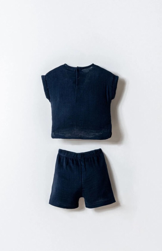 Gornji deo je lagana lanena majica u tamno plavoj boji, sa kratkim rukavima i minimalističkim dizajnom. Na prednjem delu nalazi se diskretan izrez sa dva dekorativna dugmeta, koji daje klasičan i uredan izgled. Mali logo detalj dodatno naglašava brend, bez narušavanja jednostavnosti.