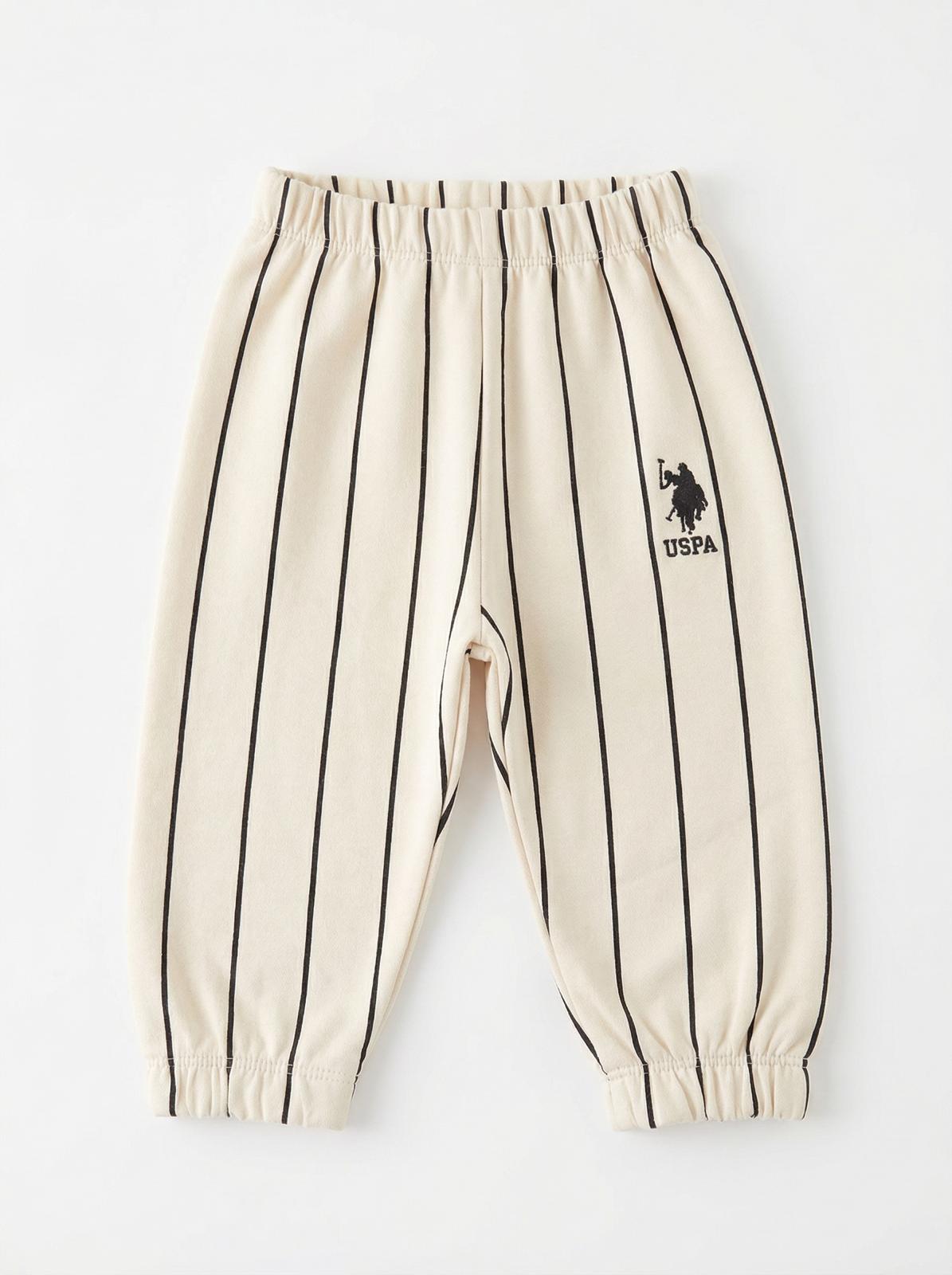 Bež pantalone sa modernim vertikalnim prugama i elastičnim nogavicama za dodatnu udobnost i lako oblačenje.