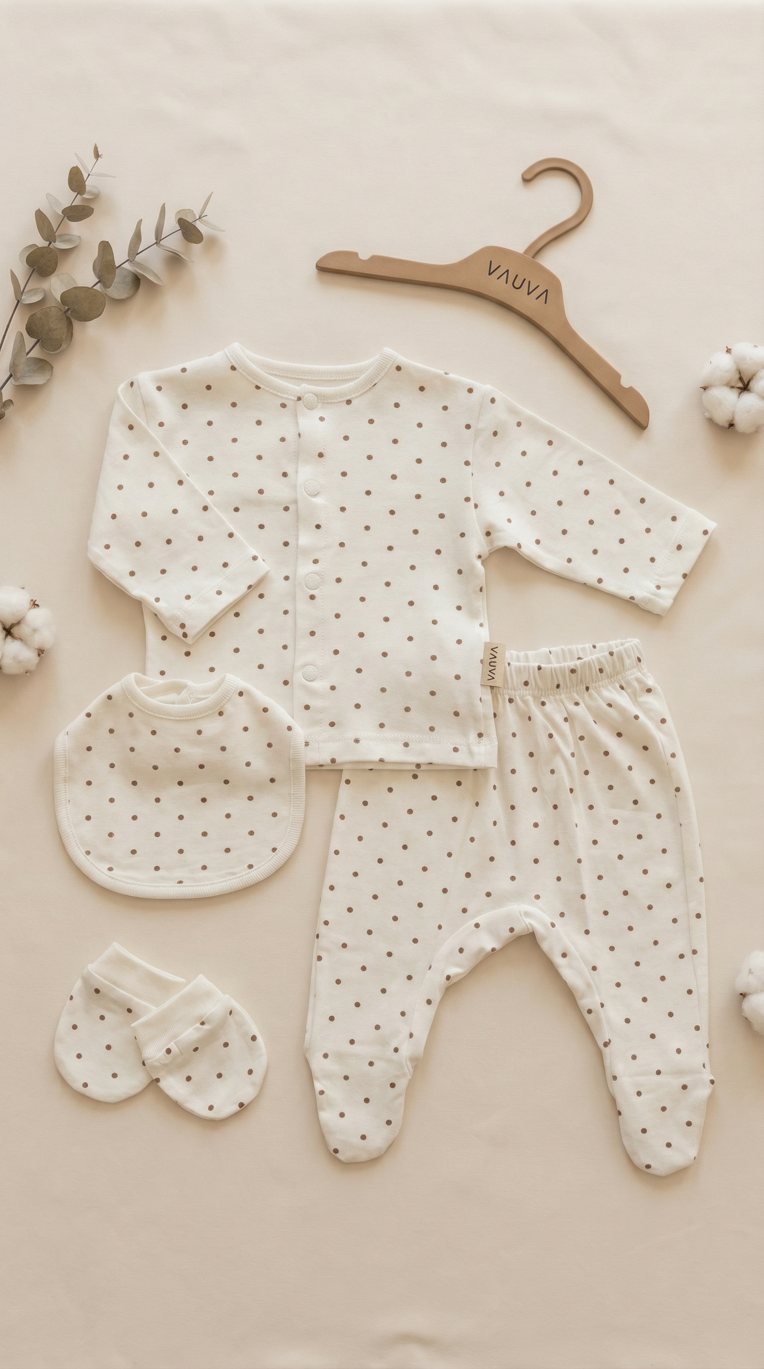 Diskretan dezen sitnih tufnica u toplim prirodnim tonovima daje kompletu elegantan i nežan izgled, savršen za prve dane bebe.